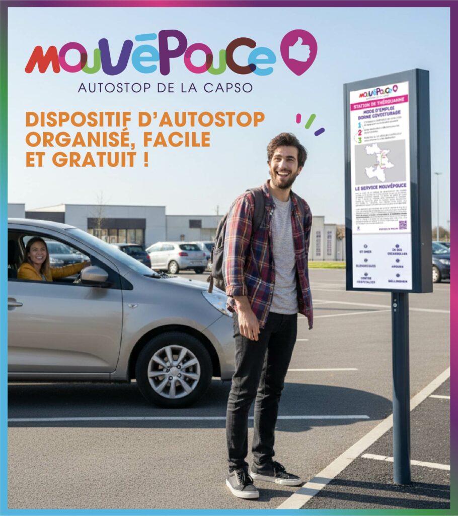L’autostop organisé est une nouvelle manière de pratiquer l’autostop. Des bornes sont mises à disposition dans les stations de mobilité de la CAPSO. Elles permettent aux passagers d’indiquer une destination pour les conducteurs. Avec MouvéPouce, l’autostop devient une aventure locale et solidaire.